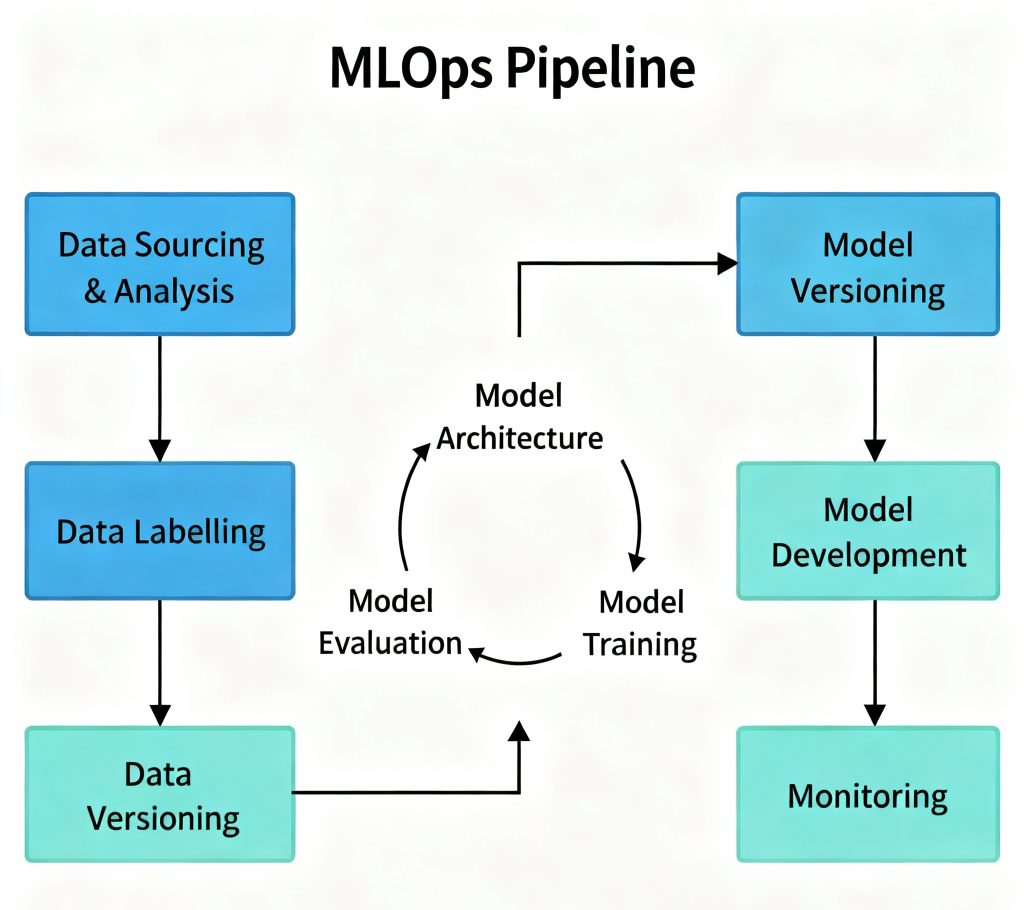 - Monitoring & Feedback: Post-deployment monitors track latency, throughput, accuracy, and business KPIs, feeding anomalies back into the pipeline to trigger retraining or rollback.