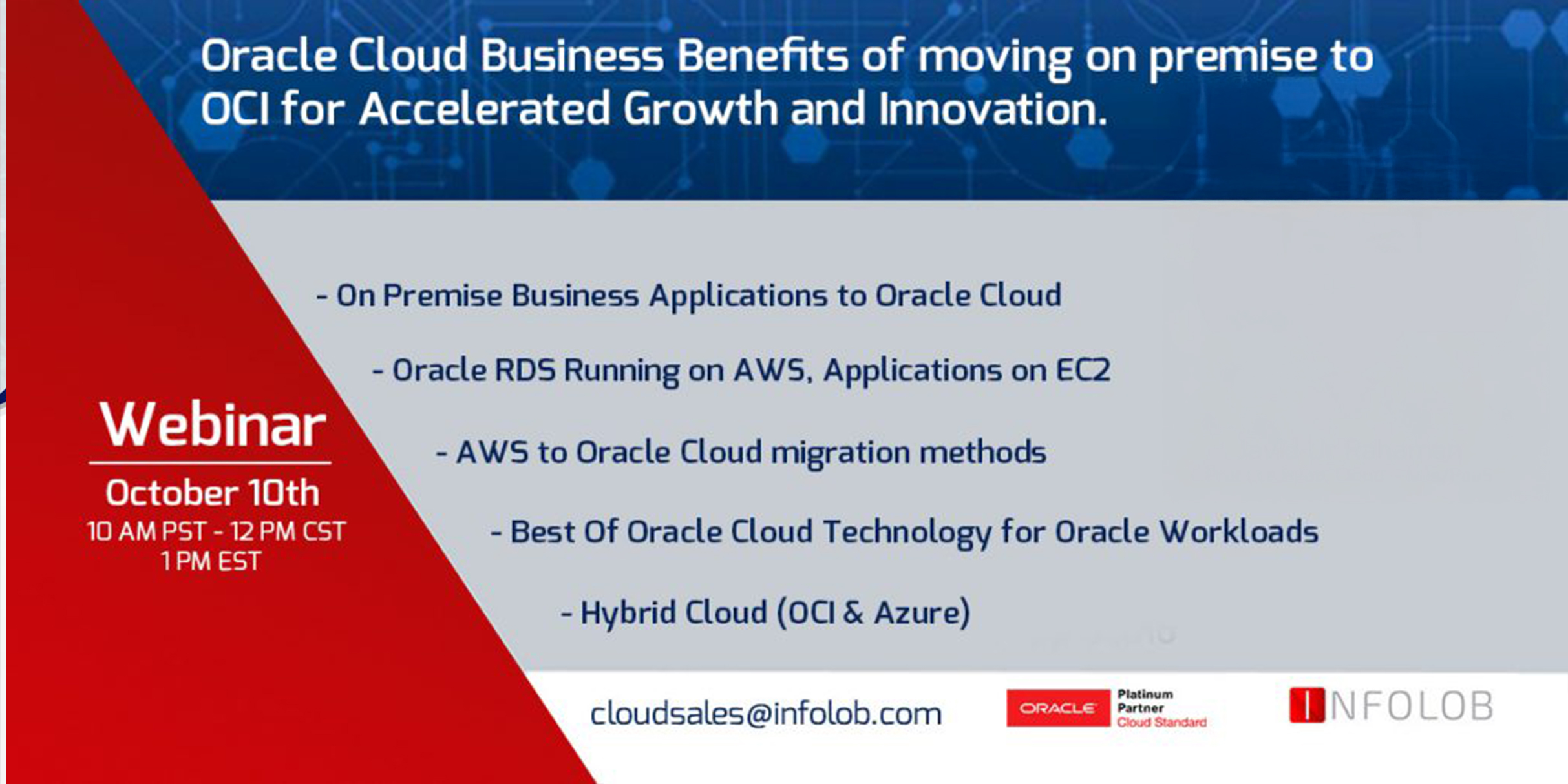 Join our webinar about Oracle Business Applications, Database Migrations from On-Premise or AWS to Oracle Cloud on October 10th at 12 PM CST! Infolob Solutions invites you to join our Practice Head, Cloud Center of Excellence – IaaS/PaaS – Javid Ur Rahaman, for a Webinar covering a clear and thorough explanation about Oracle Business Application and Database Migrations on Premise and AWS to Oracle Cloud. Javid will cover the