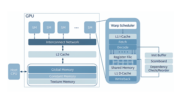 GPU physical components including CUDA and tensor cores, VRAM, and memory controllers. It determines the raw computing capabilities and GPU efficiency.