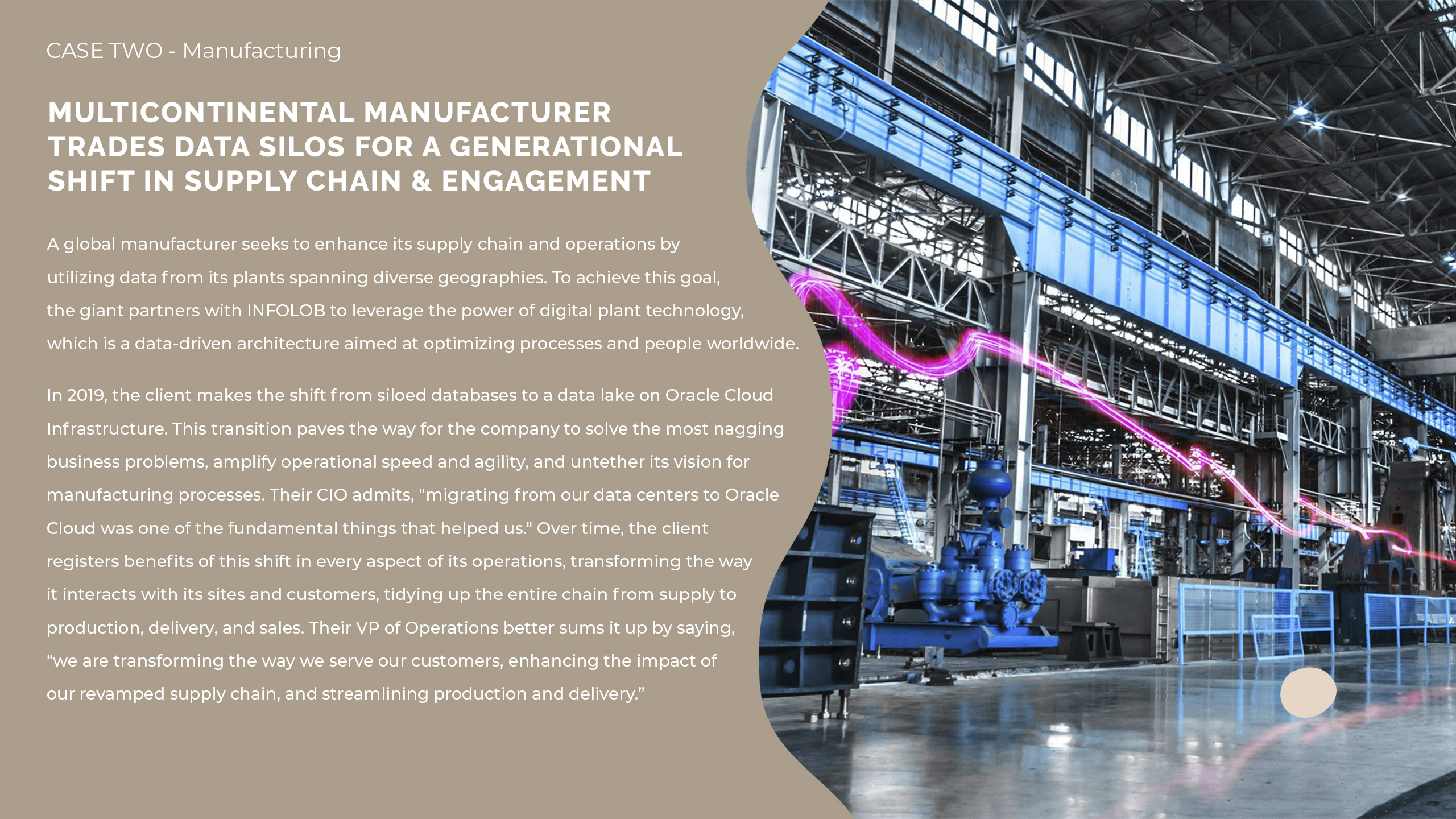 In 2019, the client makes the shift from siloed databases to a data lake on Oracle Cloud Infrastructure. This transition paves the way for the company to solve the most nagging business problems, amplify operational speed and agility, and untether its vision for manufacturing processes. Their CIO admits, "migrating from our data centers to Oracle Cloud was one of the fundamental things that helped us." Over time, the client registers benefits of this shift in every aspect of its operations, transforming the way it interacts with its sites and customers, tidying up the entire chain from supply to production, delivery, and sales. Their VP of Operations better sums it up by saying, "we are transforming the way we serve our customers, enhancing the impact of our revamped supply chain, and streamlining production and delivery.”
