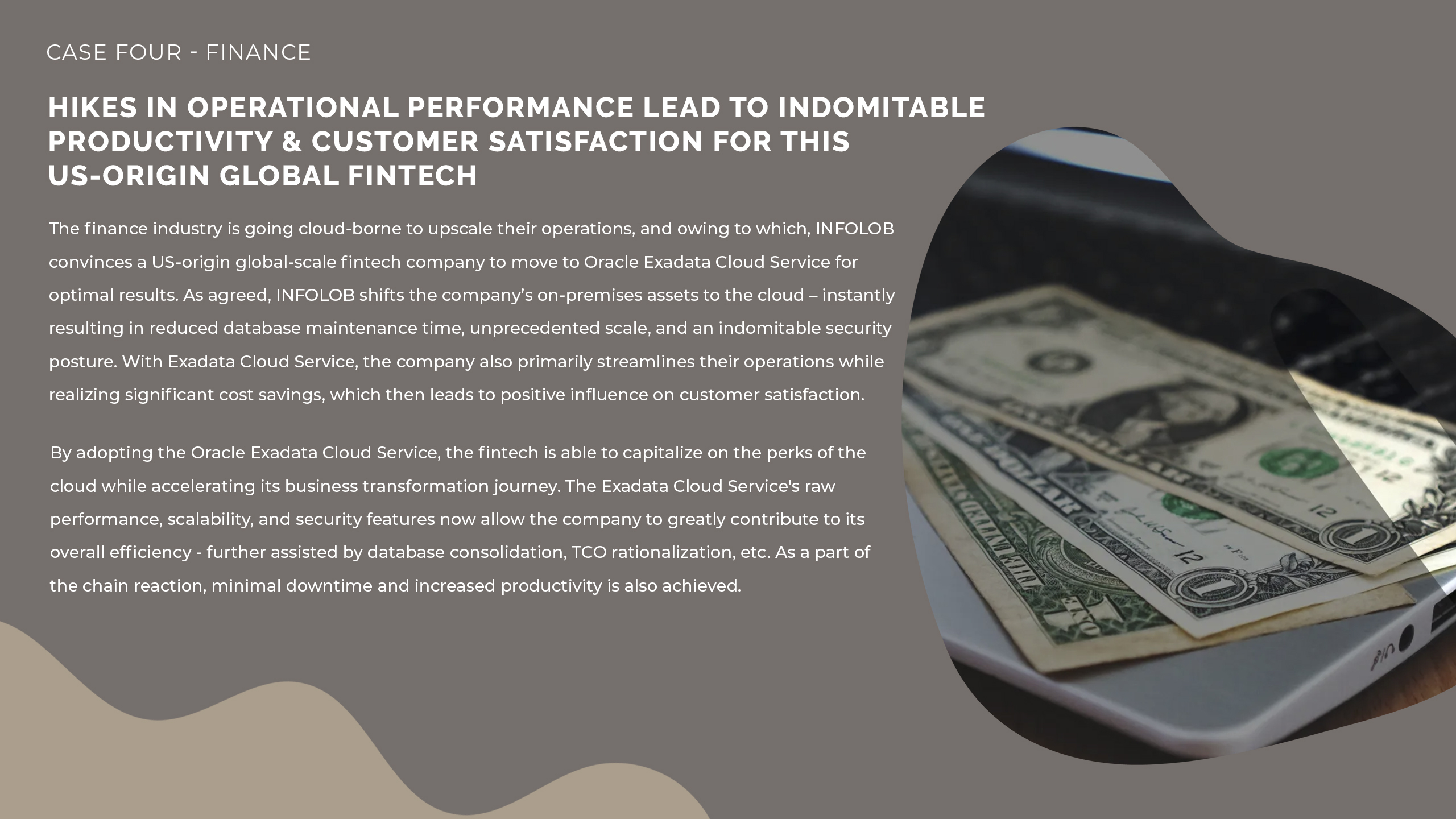 The finance industry is going cloud-borne to upscale their operations, and owing to which, INFOLOB convinces a US-origin global-scale fintech company to move to Oracle Exadata Cloud Service for optimal results. As agreed, INFOLOB shifts the company’s on-premises assets to the cloud – instantly resulting in reduced database maintenance time, unprecedented scale, and an indomitable security posture. With Exadata Cloud Service, the company also primarily streamlines their operations while realizing significant cost savings, which then leads to positive influence on customer satisfaction.